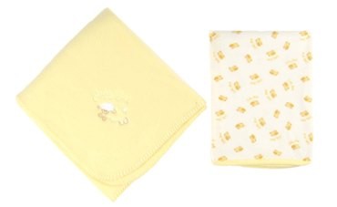 Dárkově zabalený set dvou žlutých dětských dek - 1x deka fleece 100% polyester, 1x lehká letní deka 50% bavlna 50% polyester. Obě deky jdou prát v pračce při 30°C. Jejich rozměr je 80 x 100 cm. Vyrobeno v Mexiku.